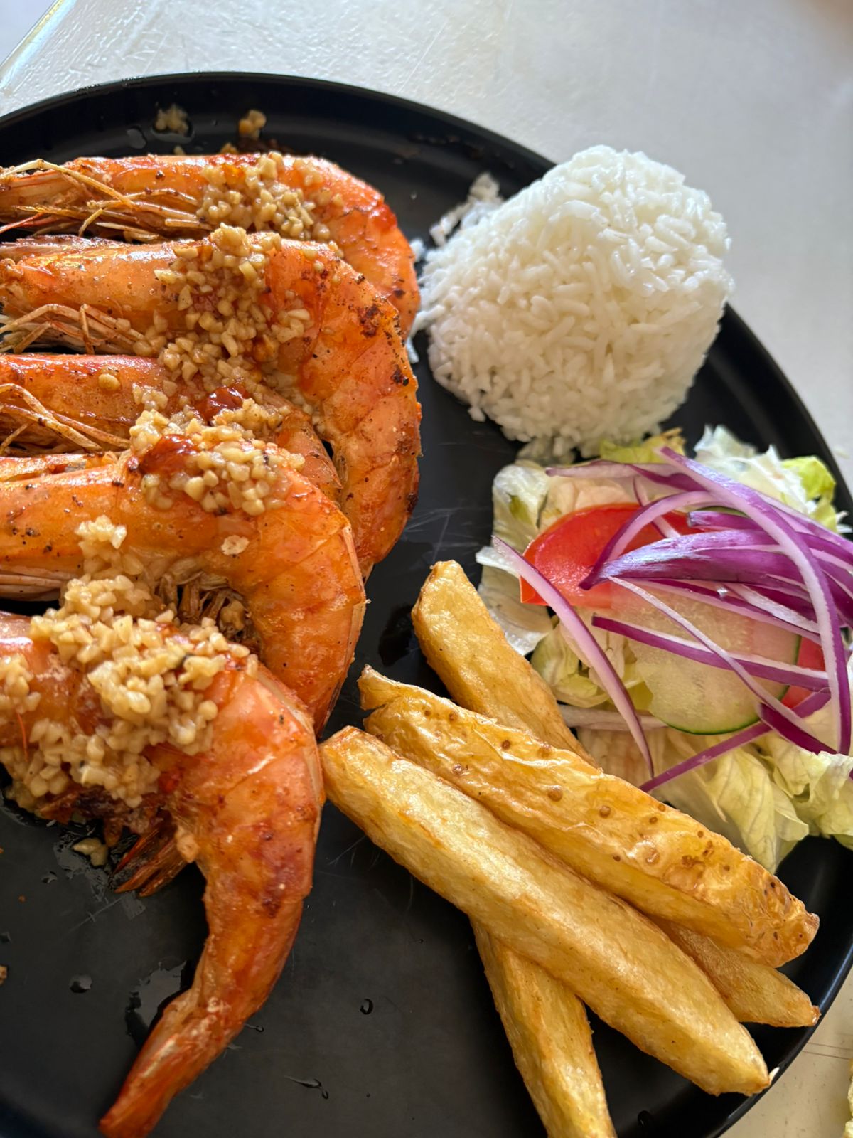 Jugosos camarones salteados en una salsa de mantequilla, ajo y un toque de cítricos, acompañados de bastones de yuca crujiente.