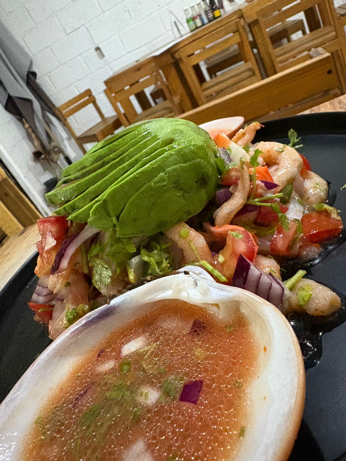 Cubos frescos de pescado marinado en limón con jitomate, cebolla y cilantro, coronado con láminas de aguacate cremoso, servido en concha.